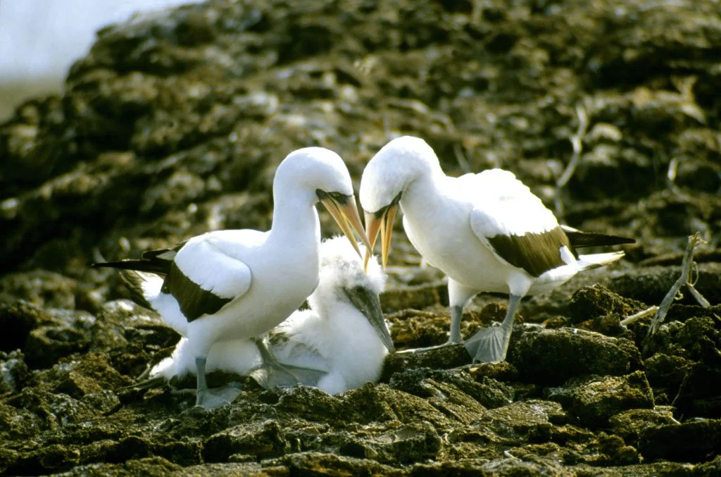 Nazca Boobies attending to their chick on a Ballesta island.